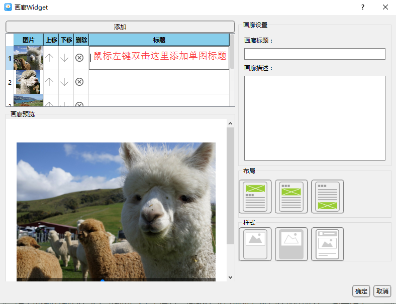答:如下圖是畫廊widget界面,鼠標定位到畫廊單圖標題處后左鍵雙擊標題空白處添加單圖標題,如下圖。